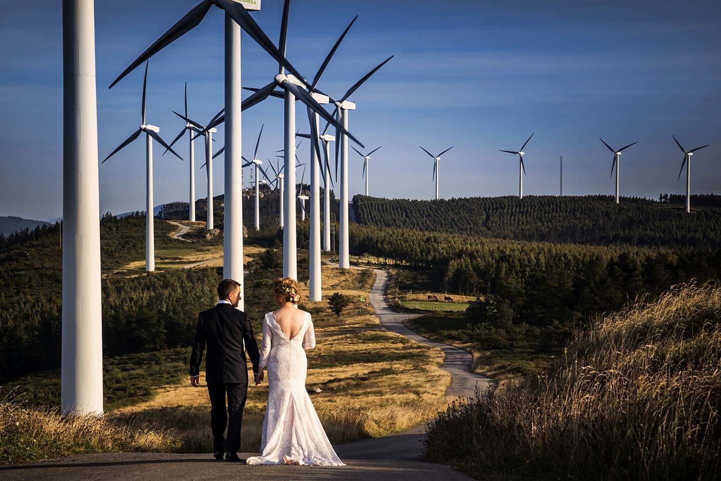 La iglesia de Carballido, en Fonsagrada, flanqueada por dos teixos centenarios, fue el emplazamiento elegido por los novios para darse el "Sí quiero". Una ceremonia emotiva, arroz por un tubo, y nos fuimos a la Serra de Meira a hacer los posados, a la sombra de los molinos eólicos.