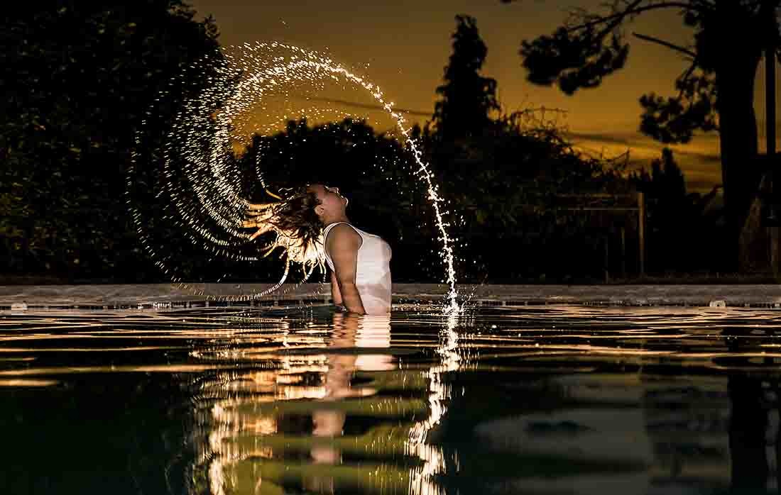 Ya de vuelta en su finca, nos marcamos unas nocturnas con sus perros y al lado de la piscina, y ya cerca de las 11 de la noche, a la buena de Elia se le ocurre meterse en la piscina para hacer algunas fotos. Era el preludio de la postboda acuática que tendríamos en la Praia dos Castros.... pero esa será otra historia. Ahí os dejo una muestra de por qué soy fotógrafo de bodas.... y prebodas.